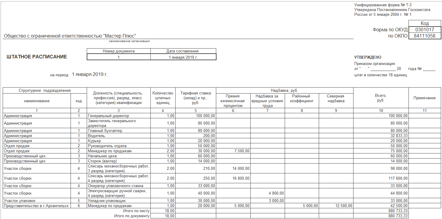 - Введите в программу штатное расписание для организации ООО «Мастер Плюс» на 01.01.2019.