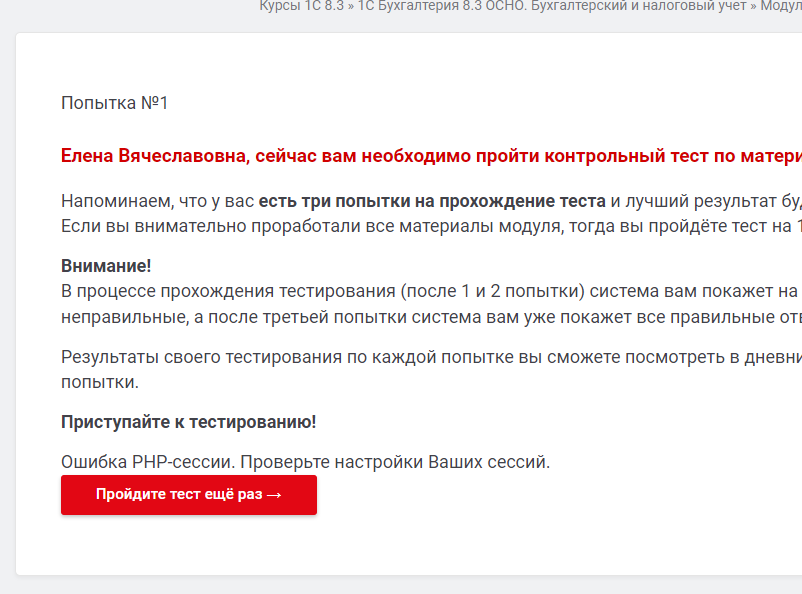 Здравствуйте! Прошла Контрольный тест по Модулю № 10, уже хочет чтобы я 5й раз сделала тест и дальше не пускает