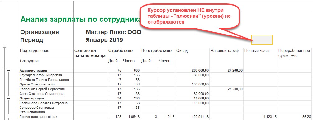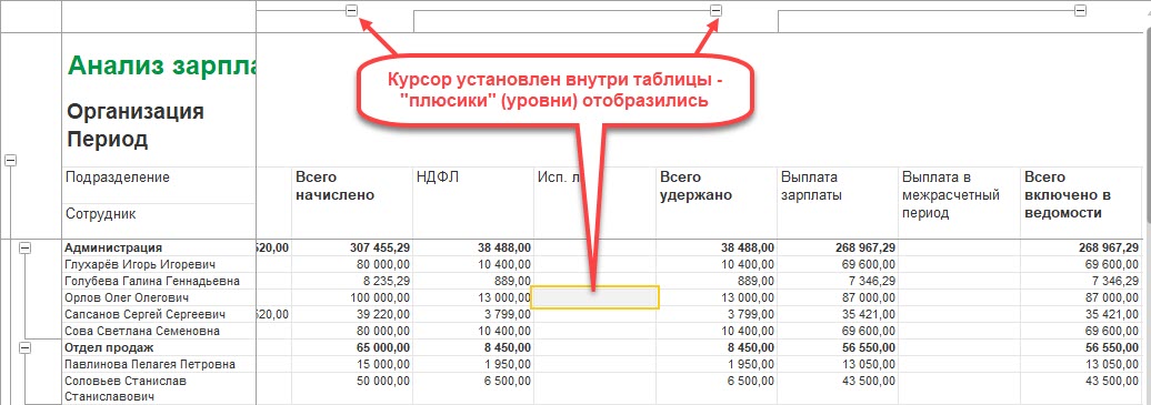 Почему в отчете Анализ зарплаты у меня не отражаются “плюсики” (уровни), чтобы свернуть или развернуть начисления?